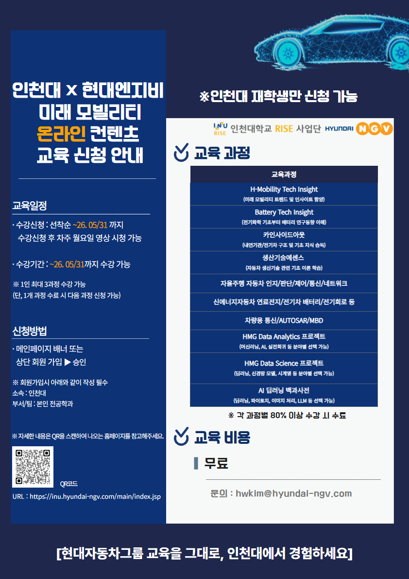 인천대 현대엔지비 미래모빌리티 온라인 컨텐츠 교육신청 안내]선착순이며 12/31일까지 신청해 주시기 바랍니다.신청방법 메일페이지 배너 또는 상단회원가입-승인