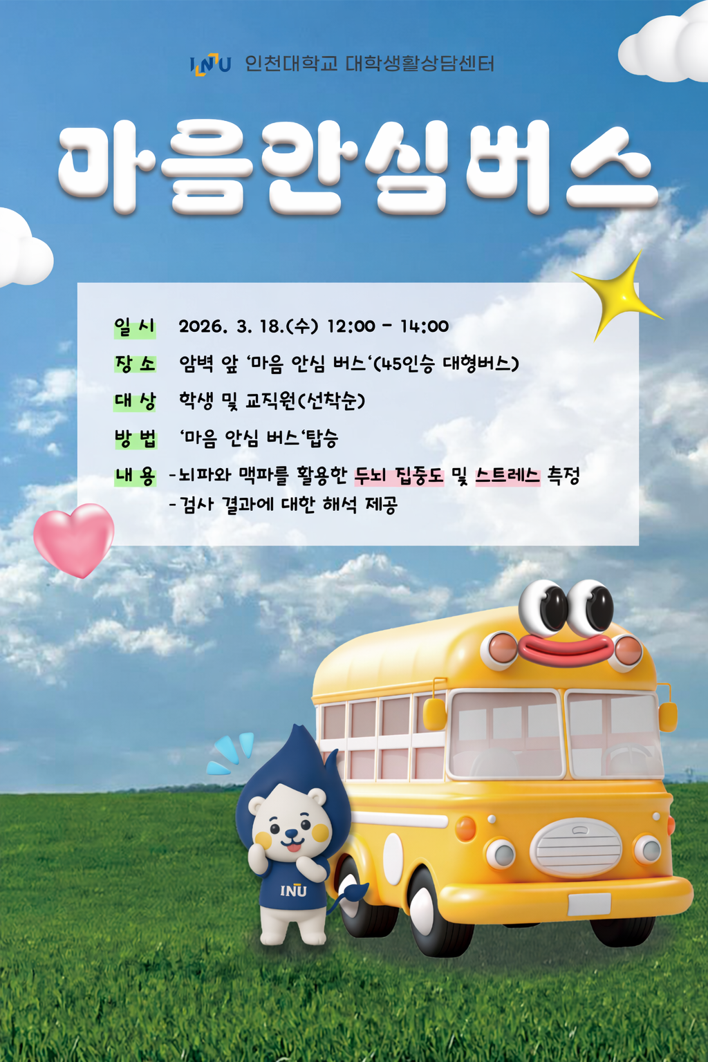 2. 인천대학교 학내 구성원의 마음건강 관리를 위해 인천광역정신건강복지센터와 협업 하여 3월 마음안심버스를 아래와 같이 운영하오니, 학생과 교직원이 활용할 수 있도록 적극적인 홍보와 참여를 부탁드립니다.